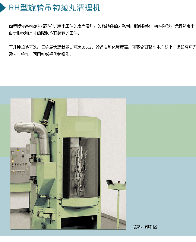 設(shè)計(jì)和操作順序 設(shè)備無需地基,室體主要由旋轉(zhuǎn)的拋丸室組成,拋丸室又分隔為兩部分,拋丸單元和丸料清除單元。每個(gè)分隔單元裝有旋轉(zhuǎn)吊鉤,吊鉤上懸掛被清理的工件。設(shè)備裝料的區(qū)域是敞開的,這樣,當(dāng)工件在一側(cè)室體被拋丸清理時(shí),可以在另一側(cè)室體卸料和裝料。無論室體旋轉(zhuǎn)到下一任何位置時(shí),只要室體停止旋轉(zhuǎn),丸料流立即被切斷。連續(xù)旋轉(zhuǎn)的吊鉤,可以在拋頭前針對(duì)每個(gè)拋丸周期,標(biāo)識(shí)3個(gè)不同的位置,以避免拋丸死角。丸料經(jīng)過分離單元去除雜質(zhì)重新喂到拋丸器里。